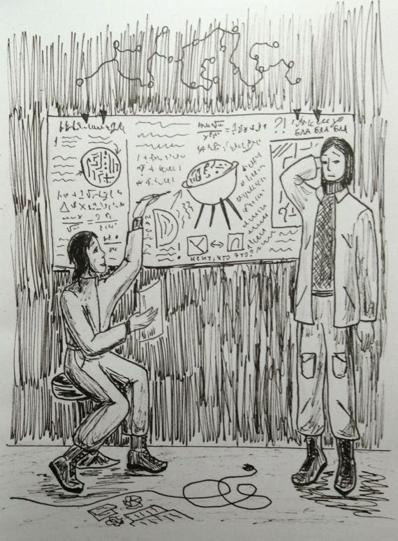 | Анитра Наверное, это получилось случайно, но в правом верхнем углу чертежа последняя буква «а» подозрительно смахивает на «я». Рука дрогнула)Хотя при желании можно счесть человека слева увлечённым изобретателем, а правого – крайне озадаченным Ленмаром. Так и есть.Р. S. Захотела добавить ссылки на иллюстрации в шапку сборника «По следам». Можно же? Конечно)1 | |